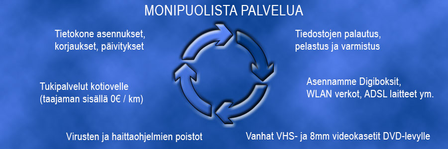 Jos tietokone tökkii tai toimii hitaasti. Me korjaamme sen tai pahimmissa tapauksissa asennamme kokonaan uudestaan ja kone on sen jälkeen kuin uusi.